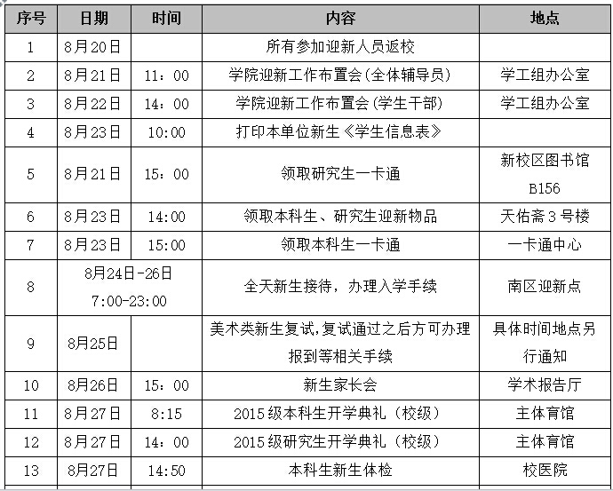 2、2015级本科、研究生新生报到时间为:2015年8月24日-26日(具体见附件),涉及迎新工作的部门、老师及学生干部请根据迎新工作安排表,做好相应工作。