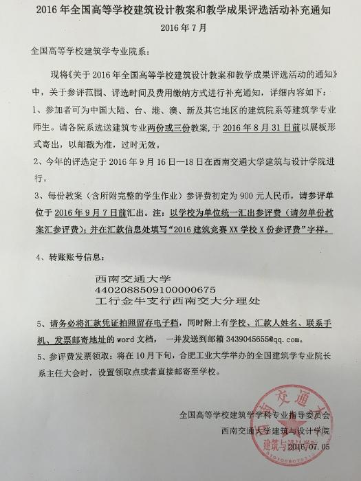 2016年全国高等学校建筑设计教案和教学成果评选活动补充通知