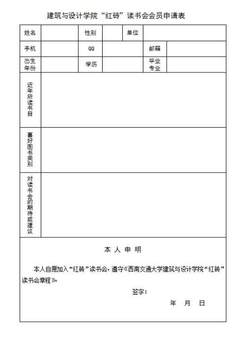 下载阅读《建筑与设计学院“红砖”读书会章程》(详见附件),若认可其内容,请填写《建筑与设计学院“红砖”读书会报名表》(详见附件),10月30日前发送到指定邮箱。或复制报名表打印手写后,交至X8225办公室。