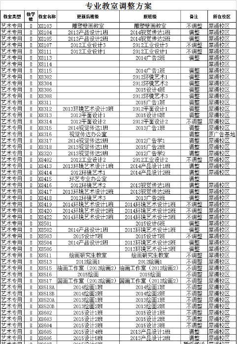 根据我校2015年文科院系学科调整安排,现将部分我院艺术类专业班级教室调整通知如下(见附件),请各班级于2015-2016学年度第一学期(本学期)内完成班级调整。