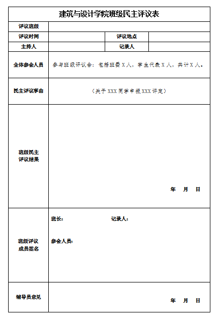 第七条 学院设立各班级为基层民主评审小组,由班长任组长,学习委员任副组长,班级同学均为成员。