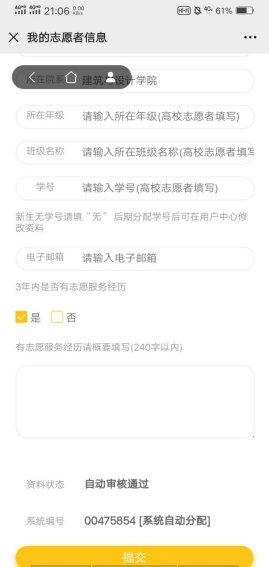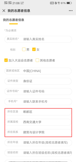 步骤三:填写我的志愿者信息。注:所在区县“郫都区”,所属高校“探花视频