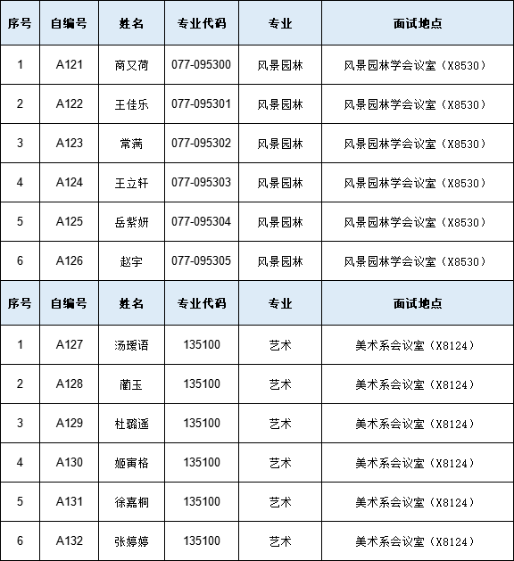 第一考场: 8号教学楼五层X8530教室(风景园林系会议室) 面试专业: 077-095300 风景园林