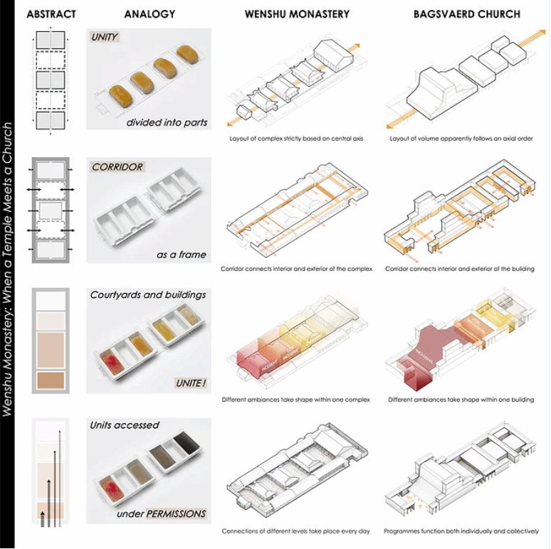本次Archiol 国际论文竞赛以发掘探索世界各地的temple建筑为题,temple不仅包括东亚的佛教寺庙,还涵盖了从古希腊帕特农神庙、印度的印度教神庙,到东南亚吴哥窟等等。我院师生团队的论文《文殊院:当寺庙遇见教堂》很好地呼应了temple内涵的国际性和多样性。文章打破建筑史叙事常规,从建筑空间角度总结了四条设计原则,比较分析了不同文化背景下传统寺庙和现代教堂在形式逻辑和使用功能上的共性。