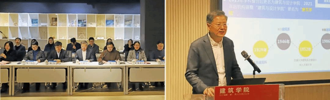 、主要工作、对照问题、未来展望四个主要方面进行了工作汇报。沈中伟在汇报中回顾了学院悠久的办学历史和办学成就。他分别从人才队伍建设、学科学位点建设、教育教学、科学研究、平台建设、国际化工作、党建工作、学生工作、就业工作九个方面汇报了工作情况与成效,同时针对学科建设情况进行了对比分析,梳理了学科发展的明显短板和相对不足。对于学院未来发展,沈中伟从战略、定位、目标、举措、阶段、路径等方面进行了展望。建筑学院未来将按照“短期扬长避短塑造学术声誉,取长补短打造学科实力。转型期抓好学科,提升位次,增加博士点,集聚优秀青年人才,提升科研团队水平;抓好博士后流动站建设,科研先行,设计协同,提升教学。中期在交通领域、地域性等领域巩固领先优势,深度交叉双碳、智慧、韧性研究领域形成更为巩固的学术高地。学科建设水平稳步提升。长期要在建筑类学科的主干方向形成高原,在建筑学科的特色方向形成高峰。学科排名争取进入A类”的“三步走”的规划,走内涵式高质量发展道路。