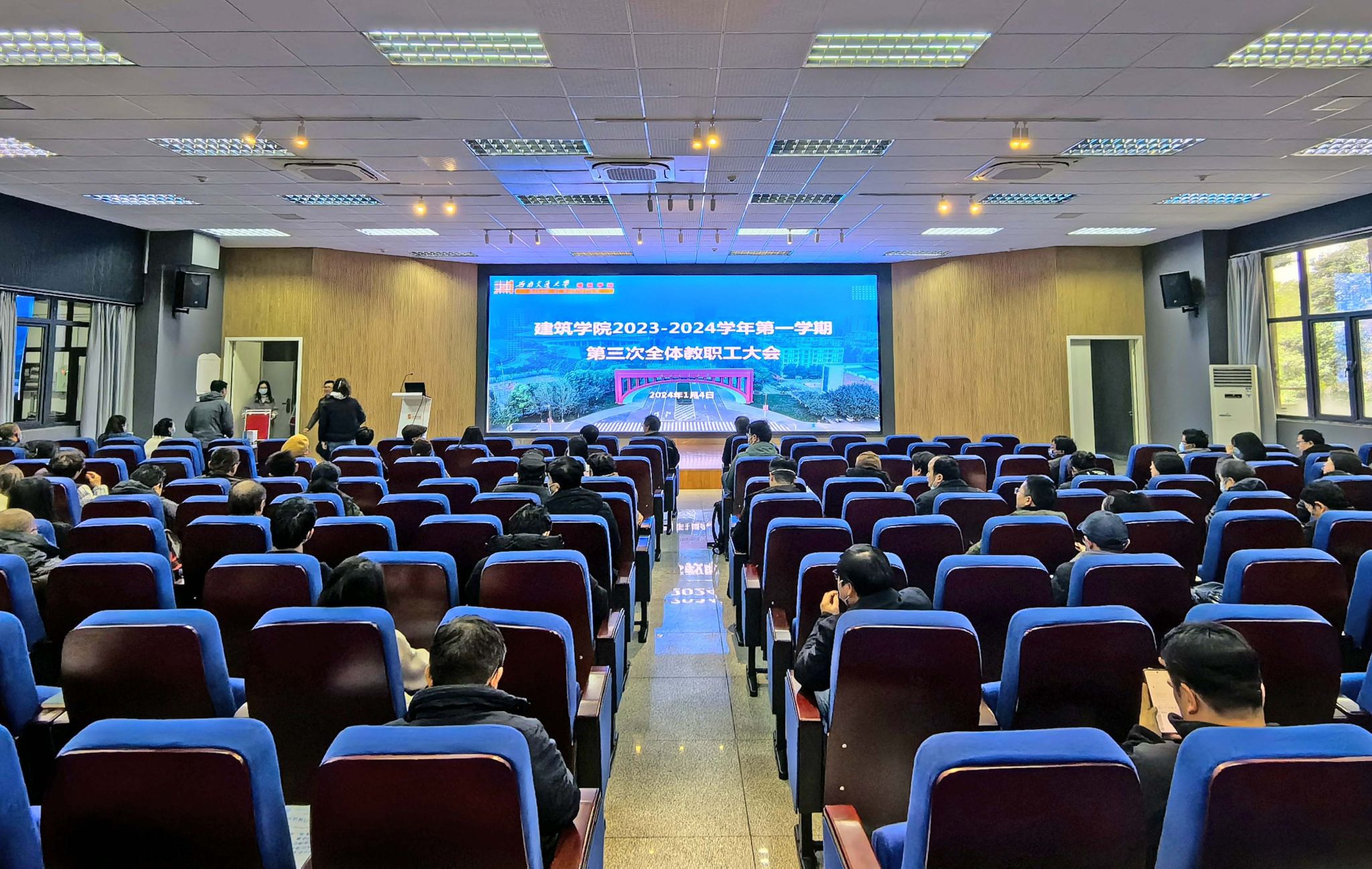 2024年1月4日下午,建筑学院2023-2024学年第一学期第三次全院教职工大会在犀浦校区8号教学楼D300报告厅举行,建筑学院党政班子及教职工参加了此次会议。会议由学院党委书记胡伟主持。