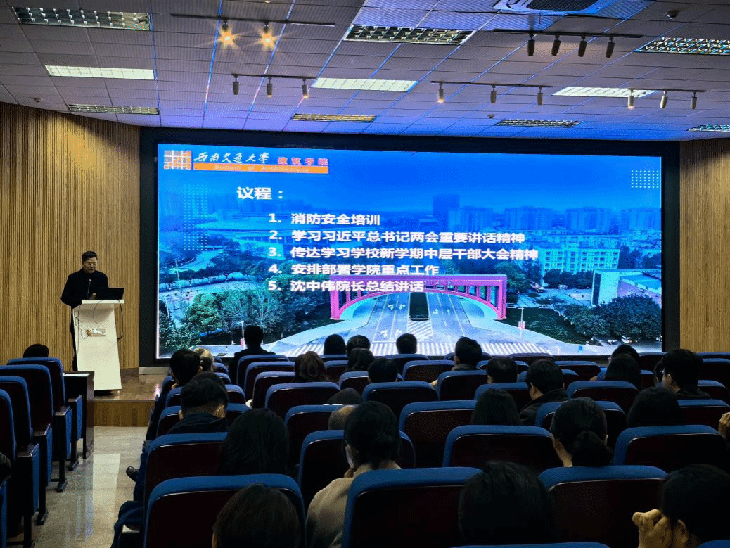 3月14日下午,建筑学院2023-2024学年第二学期第一次全院教职工大会在犀浦校区8号教学楼D300报告厅举行。建筑学院党政班子及教职工参加了此次会议。会议由学院党委副书记刘一杰主持。