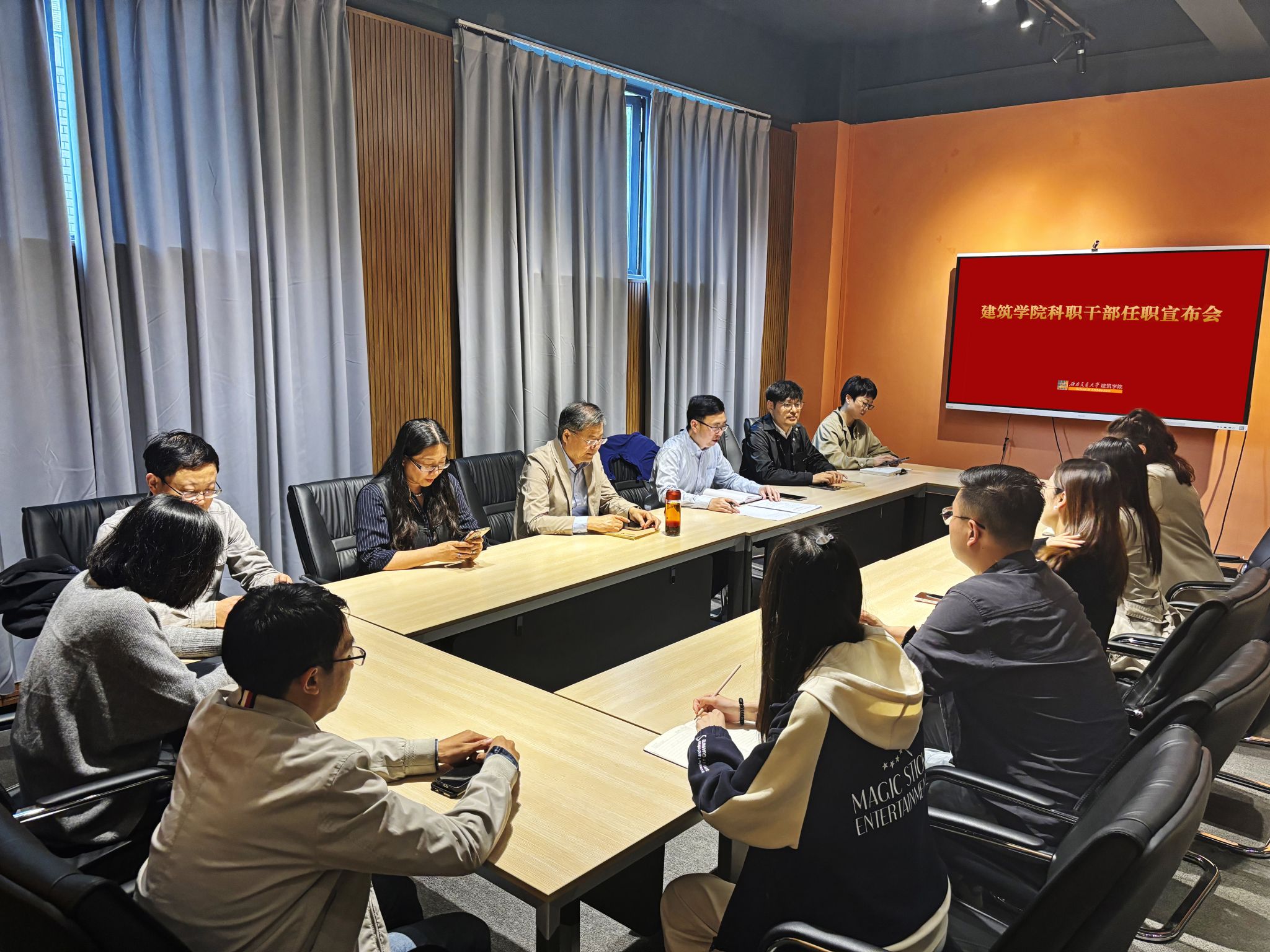 会上,学院党委书记胡伟同志宣布了孔翔榆、曾宁莎、刘野、王少婧、田方舟五位同志的任职决定。在前期个人申报、资格审核、组织遴选与考察基础上,经学校干部工作领导小组会议研究决定,聘任孔翔榆为建筑学院综合事务办公室主任;聘任曾宁莎为建筑学院教师服务办公室主任;聘任刘野为建筑学院学生支持办公室主任;聘任王少婧为建筑学院党委正科级专职组织员;聘任田方舟为建筑学院学生工作组副组长(副科级)。