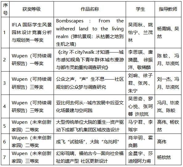 建筑学院不断提升师生专业素养和创新能力,专业教育水平在国内外建筑教育界的地位和影响力逐步提升。在金秋时节的九月,建筑学院学子在国内外竞赛中表现优异,捷报频传。在IFLA国际学生风景园林设计竞赛中荣获分析与规划类一等奖。这是我校首次在风景园林专业最高等级国际赛事中获得一等奖,实现了历史性的突破。同时在2024WUPENiCity学生作业国际竞赛中荣获一等奖1项、二等奖2项、三等奖3项、提名奖8项的好成绩。