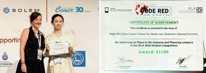 9月4-6日,第60届国际风景园林师联合会(International Federation of Landscape Architects,简称IFLA)世界大会在土耳其伊斯坦布尔国际会议中心召开。建筑学院研究生吴雨秋、姚怡宁、兰茂林的作品《BOMBSCAPES:FROM THE WITHERED LAND TO THE LIVING REALM》斩获IFLA国际学生风景园林设计竞赛分析与规划类一等奖。这是西南交大师生团队首次在该赛事中获得一等奖,实现了历史性的突破。
