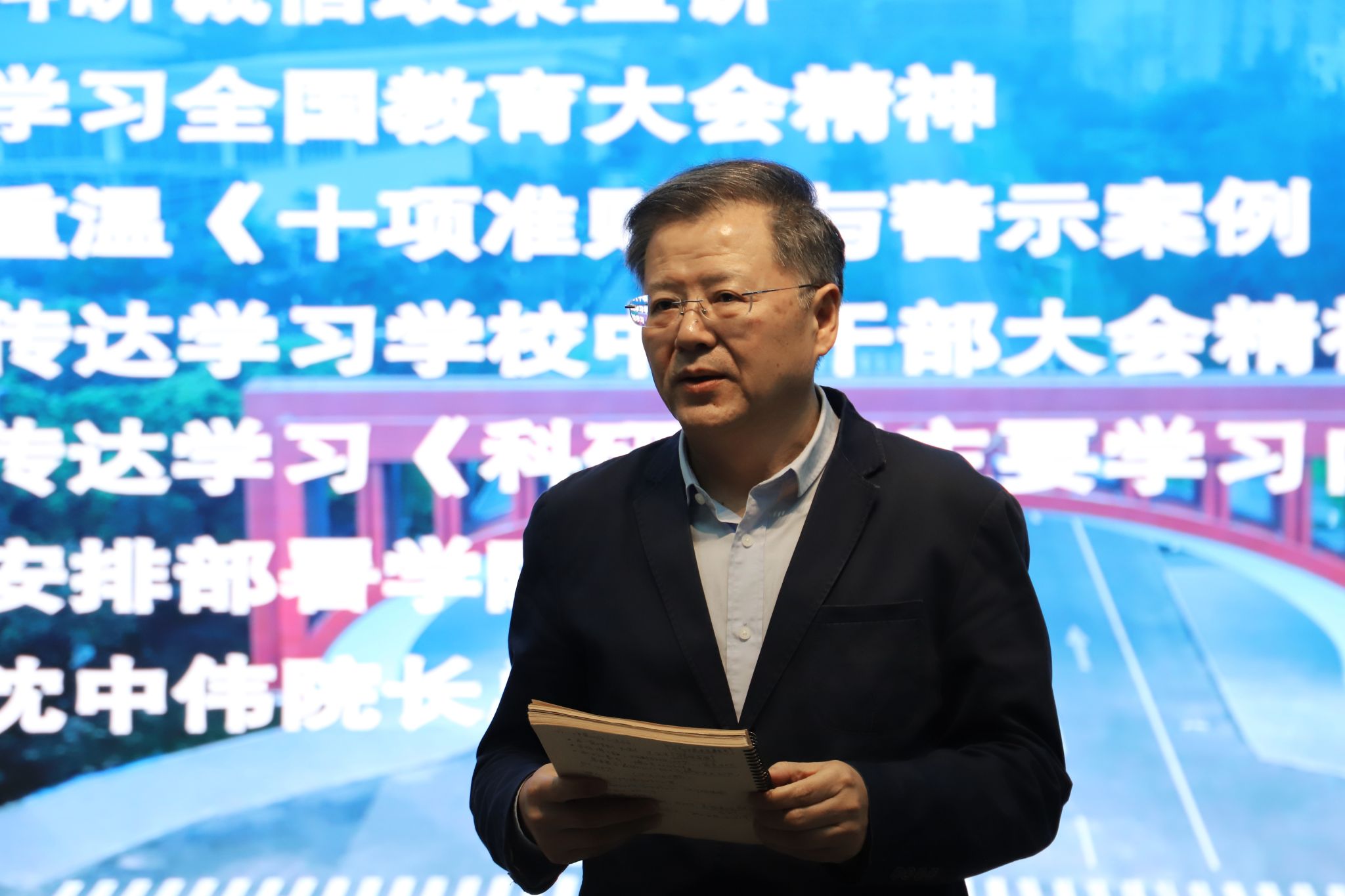 党委书记胡伟带领与会人员深入学习了全国教育大会精神,并重温了《新时代高校教师职业行为十项准则》与警示案例。他强调,全体教师要时刻牢记为党育人、为国育才的教育使命,坚决落实立德树人根本任务,弘扬教育家精神,坚守师德师风底线,以更加饱满的热情和更加扎实的作风投入到教育教学工作中。同时,他还结合学院实际情况,传达了学校中层干部大会精神,特别强调了要坚持安全稳定、意识形态与保密工作常抓不懈,时刻保持警醒,筑牢工作防线,确保改革发展稳定大局。