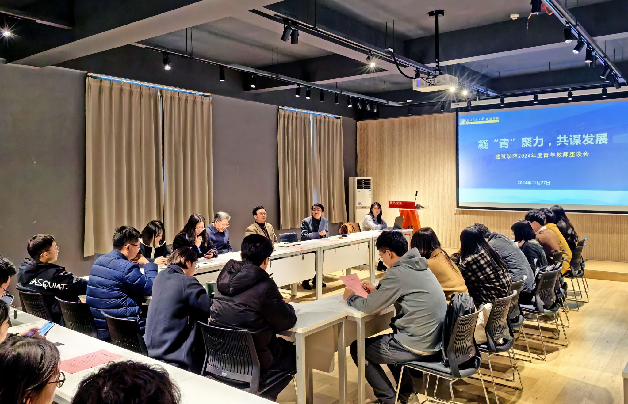 为深化学院与青年教师之间的沟通与联系,全面了解青年教师的工作情况及成长需求,进一步激发青年教师的积极性和创造力,推动学院高质量发展。11月27日,“凝‘青’聚力,共谋发展”建筑学院青年教师座谈会成功举办。学院党委书记胡伟、院长沈中伟携全体班子成员、学院教师服务办公室及相关部门负责同志、全体青年教师参加本次座谈会。副院长付飞主持会议。