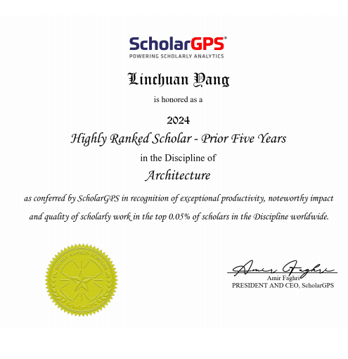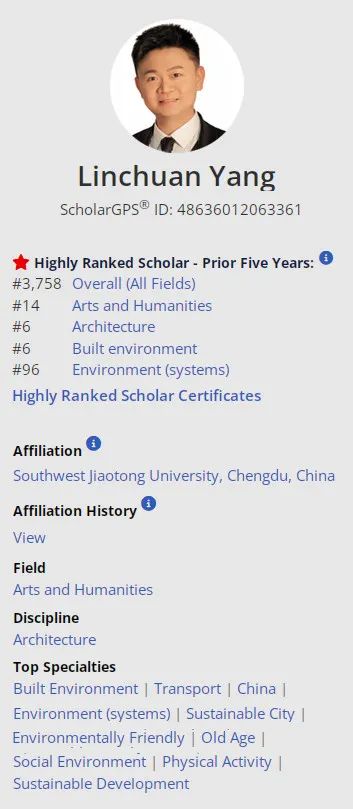 建筑学院杨林川教授成功入选全球前0.05%顶尖学者近五年榜单,在建筑学科(Discipline: Architecture)和建成环境专业(Specialty: Built Environment)两个榜单中均排位全球第六。