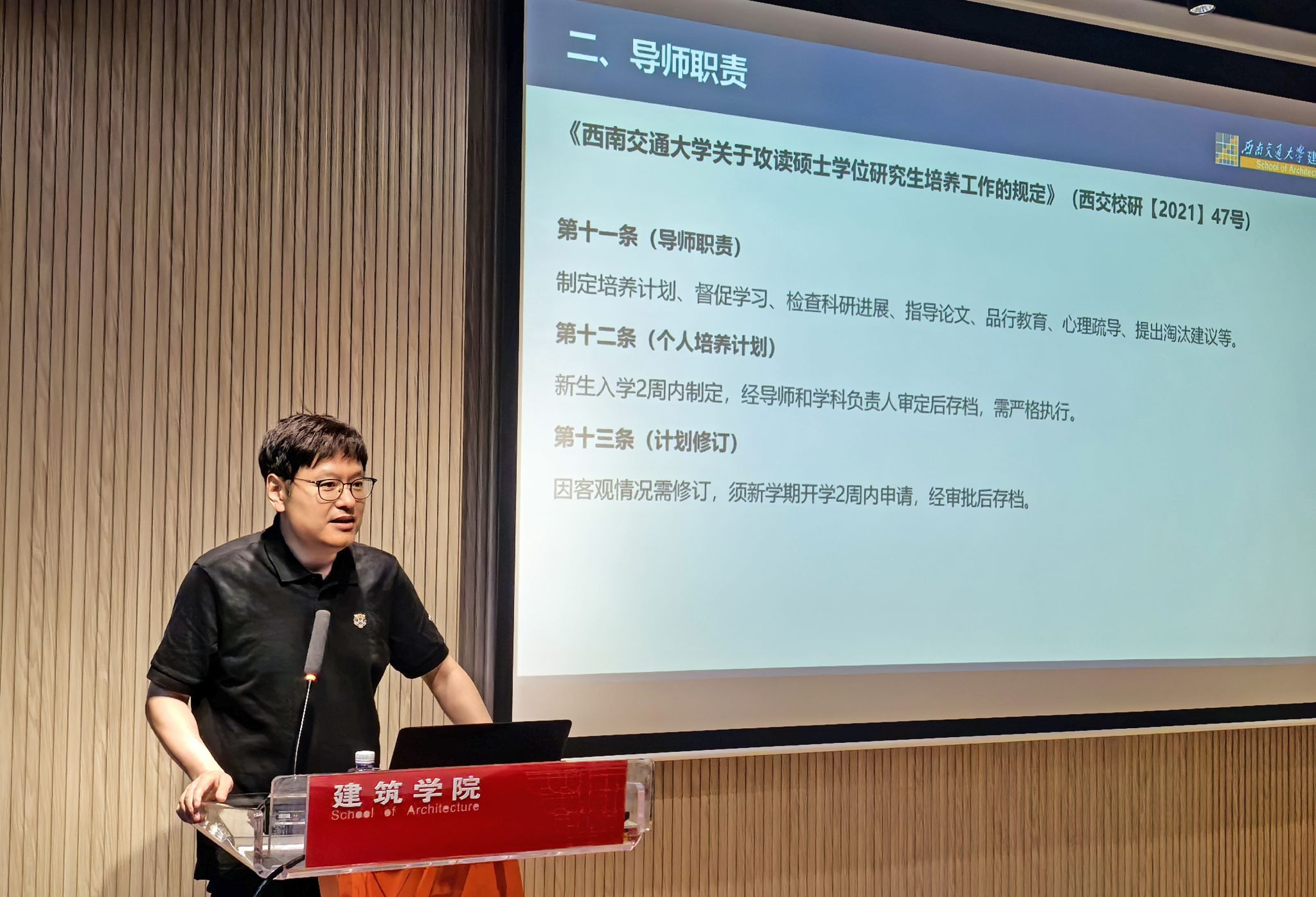5月22日,建筑学院研究生导师系列培训活动在学院A100报告厅顺利举行。本次活动以“建筑与美术专业经验互鉴,共筑卓越导师团队”为主题,学院40余名研究生导师参与。副院长崔叙主持活动并作总结讲话,现场通过专题经验分享与座谈交流,推动跨学科导师团队建设与人才培养质量提升。