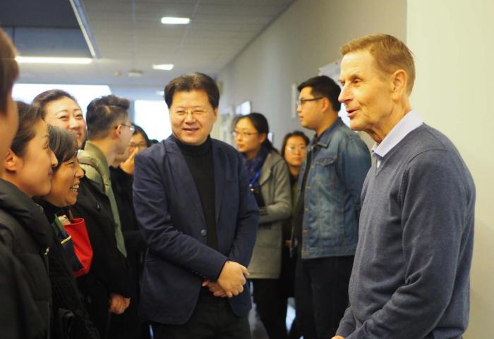 走访中,院党委书记沈中伟、院长Odgaard利用即将上课的一小段时间与同学们进行了亲切交谈,并向师生送上新学期的问候与祝福。