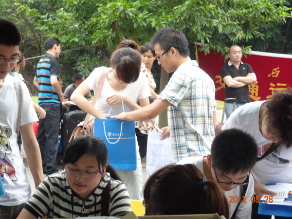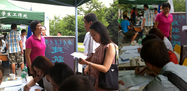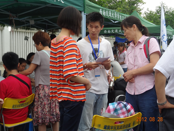 8月28日,西南交大建筑学院2012级新生迎接工作进入第二天,负责迎新的同学们早上6:00便守候在了学院迎新点,耐心的等待着每一位来报到的同学。