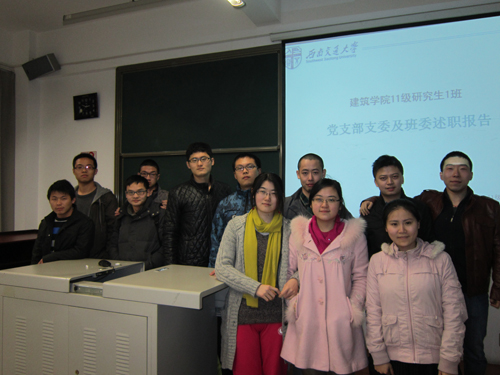 建筑学院2011级研究生1班共计22人,其中党支部与班委成员共计10名,成为班级建设的骨干力量。班干部是班级建设与管理的枢纽,沟通各辅导老师的桥梁。办事高效、踏实负责的班干部成员在优秀班集体的建设过程中起着至关重要的作用。班级实行班委问责制度,明确班委责任,促进有效工作,每学期伊始,班级将召开班委述职报告,检查与督促班干部工作情况,促进班委各司其职,为班级建设增砖添瓦,并在班委述职报告后讨论制定班级学期计划,各个班委分别负责相关类型的班级活动,促进班级良好的学术氛围,丰富大家的课外生活;班级每月定期召开班会,及时了解班级同学的状况,同时积极传达学院班级工作指示;同时在班级管理中为方便上传下达,加强班级通讯设施建设(QQ群、飞信、邮箱、手机通讯等)。为努力提高优秀班干部的思想觉悟,发挥其先进带头作用,该班党支部组织了学习“胡锦涛总书记七一重要讲话”征文活动、关注老年人生活状况,探求新型养老建筑等一系列活动。班级还开展明细班级财务管理制度建设,每学期定期将班级收支情况公布于班级QQ群,接受同学们的监督。这些管理办法的开展有效地提高了班级工作进行的效率并加强了对班干部的监督和管理。