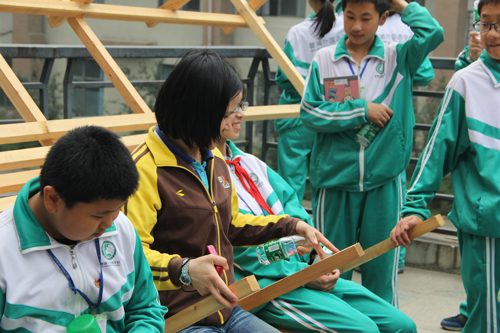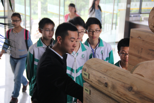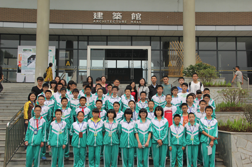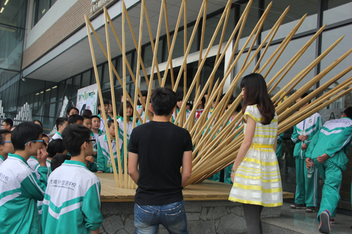 5月9日下午14:00,犀浦外国语学校老师带领五十余名学生来到建筑学院参观首届建造节作品,学院辅导员方翰老师接待了来访师生。本次参观由学院志愿者为大家一一讲解建造节作品。