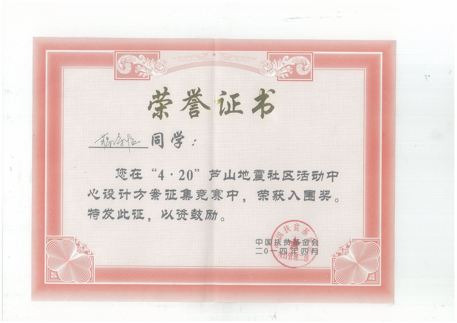 中国扶贫基金会、共青团四川省委共同举办的“4.20”芦山地震灾后重建社区活动中心设计方案征集竞赛,旨在为加强灾区基层文化建设,丰富灾区群众文化生活,鼓励灾区群众走出家门、融入社区,并培养优秀的青年设计人才。我院学生团队,以“疗养空间”为设计理念的天全县老场乡红岩村社区活动中心方案最终获得入围奖(最高奖),全国获得入围奖的共六项方案。