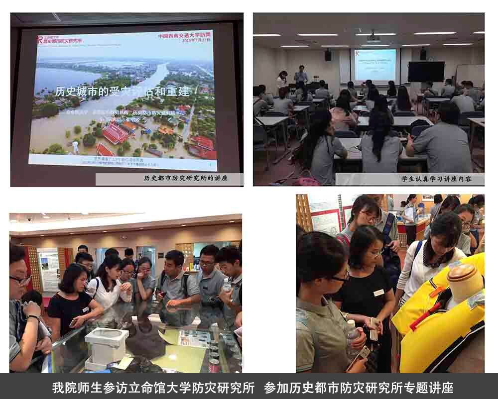 在立命馆大学(衣笠校区)的教学中,同学们参加了与立命馆大学国际交流科的交流活动,立命馆大学国际处老师耐心详细地为大家解答了关于赴日本留学的相关问题,之后在立命馆大学历史都市防灾研究所开展了学术交流活动,历史都市防灾研究所铃木所长为大家介绍了关于日本都市防灾等一系列经验和问题。