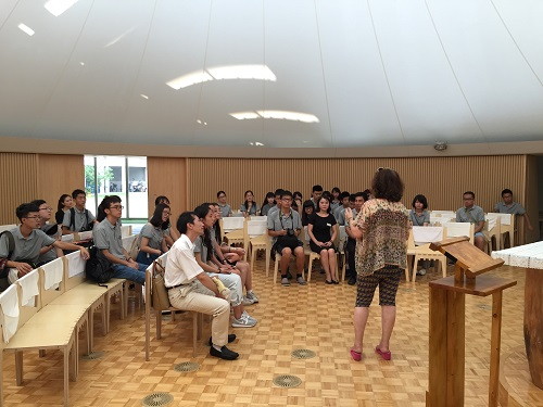 在参观兵库县“纸教堂”的教学活动中还邀请到金千秋老师及原神户市规划局局长垂水英司老师。纸之教堂( Paper Dome),即用纸质材料建造的教堂。目前世界共有两座纸教堂,均由日本著名建筑师坂茂设计。他是2014年普利兹克建筑奖获得者,师生一行慕名而来,期待感受建筑大师的作品。初次来到“纸教堂”的第一印象,就是安静。和周围安静的街道一起,端详的坐在那里,瞩目每一个来到的人们。由于“纸教堂”是日本阪神地震后的作品作为地震过后的集会场所,比起那些庄严沉重的石头教堂来说,来到这里会有一种被上帝眷顾和拥抱的感觉。走进“纸教堂”以后,上方射下来的几道光晕,一下子把教堂的氛围衬托起来,外墙上打开的采光窗把光线投射在天花板的白布上,增强了圣洁感。栗书记为学生们讲到:坂茂的Paper Dome,灾后重建不仅仅是建筑物本身,更重要的是人的聚集场所,即:Dome。