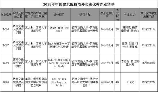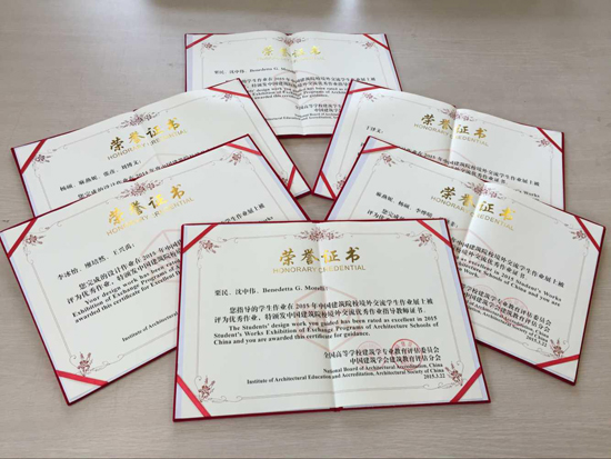 2015年3月, 在中国建筑院校境外交流优秀作业评选中,经全国高等学校建筑学专业教育评估委员会、中国建筑学会、中国建筑学会建筑教育评估委员会评选,我院4份作业获评2015年境外交流优秀作业。评选中我院学生:麻燕妮、杨硕、李烨晴、单涤非在意大利罗马大学建筑学院共同完成的《Start from the past》;王贝、代阳、付一然、王墨瀚在意大利罗马大学建筑学院共同完成的《融入与迸发——罗马研究学院设计》;李冰怡、廖培然、王兴禹在意大利罗马大学建筑学院共同完成的《HillPizza della moretti renewal in Italy》;于泽文在美国俄克拉荷马州立大学农学院园艺景观系完成的《EXHIBITION Shaping the Walls》获评2015年境外学生优秀作业奖。