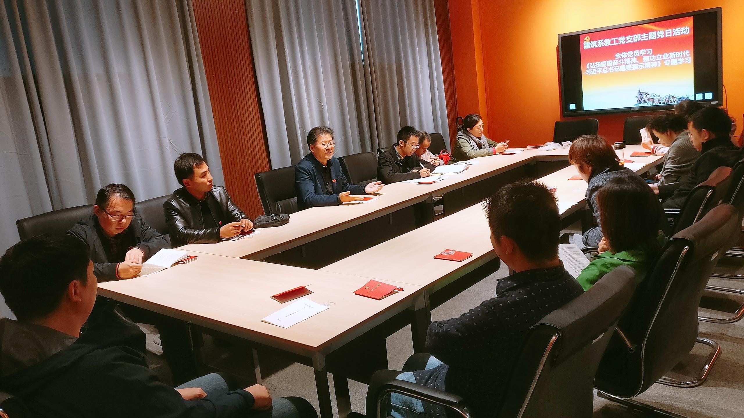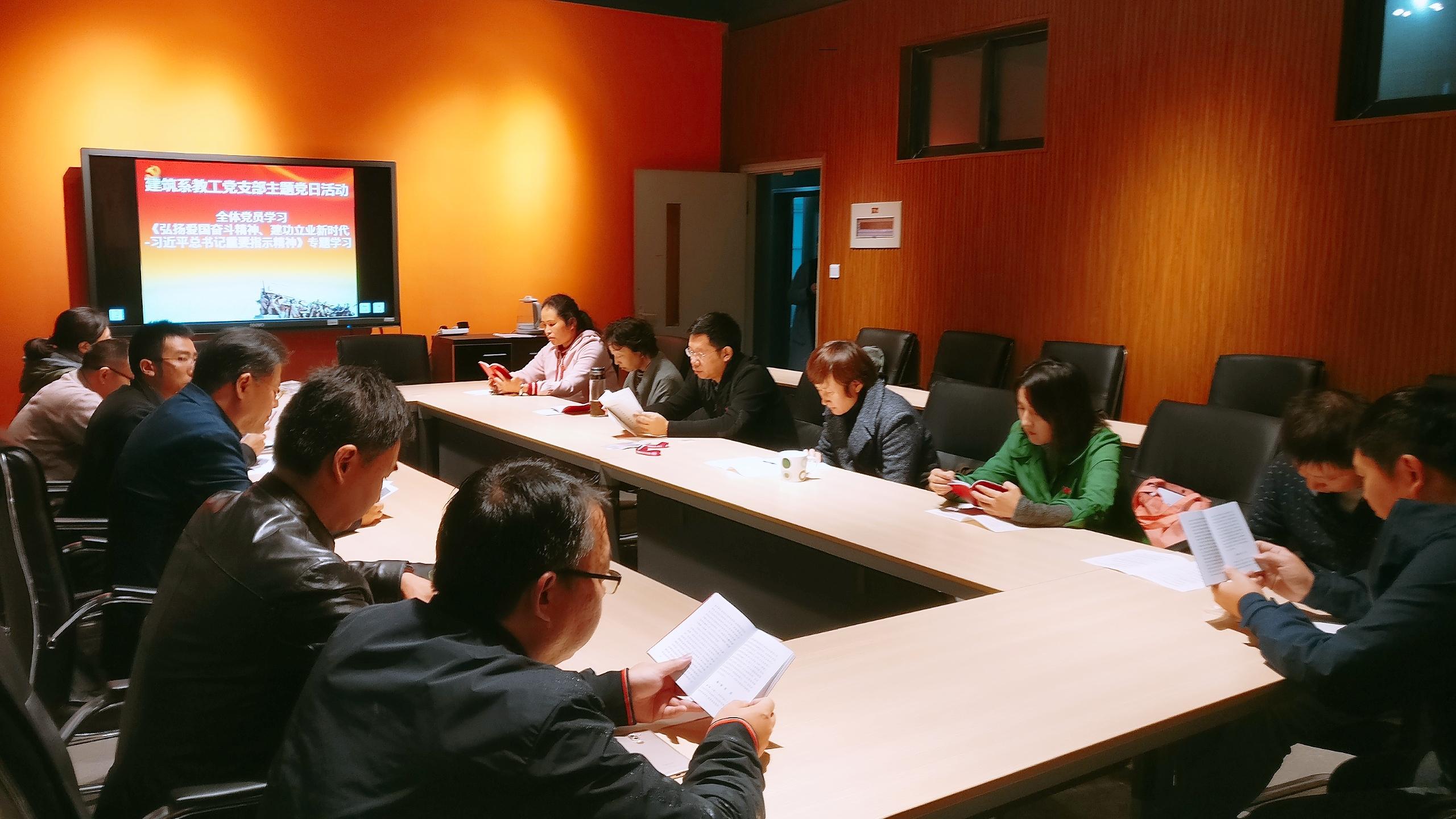 2018年10月18日,建筑与设计学院建筑系教工党支部在建筑系会议室召开支部会议,会议由党支部书记付飞同志主持。会议先对党章的第五章内容进行了学习,大家轮流朗读党章内容,对党章内容进行深入的理解,领会党章的要义。学习完党章之后,建筑与设计学院建筑系教工党支部开展《弘扬爱国奋斗精神、建功立业新时代——习近平总书记重要指示精神》专题学习:爱国奋斗,是中华民族生生不息代代相传的民族基因,是新时代高扬的主旋律;中国特色社会主义进入新时代,弘扬爱国奋斗精神具有特别重要的现实意义。大家认真学习习近平总书记重要讲话精神后,认为在中国特色社会主义新时代应自觉弘扬践行爱国奋斗精神,不忘初心、牢记使命,要增强“四个意识”,坚定“四个自信”,把教师们的个人理想自觉融入国家和学校发展事业中。此次会议还学习了习近平总书记在全国教育大会上关于“坚持中国特色社会主义教育发展道路,培养德智体美劳全面发展的社会主义建设者和接班人”的重要讲话。同时,会议传达中共探花视频