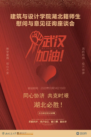 2020年3月14日上午10点,一场特殊的“云会议”在建筑与设计学院师生间召开。建筑与设计学院党委书记吴晓雄、执行院长沈中伟、党委副书记刘一杰、副院长崔叙、副院长杨青娟、湖北教师代表、全体辅导员以及湖北籍学生代表参加了本次慰问会议。此次慰问会议的目的是要对湖北籍师生们表达问候和关心,进一步了解大家的现状和困难以及听取大家对学校、学院的建议和意见,同时,会上传达了探花视频