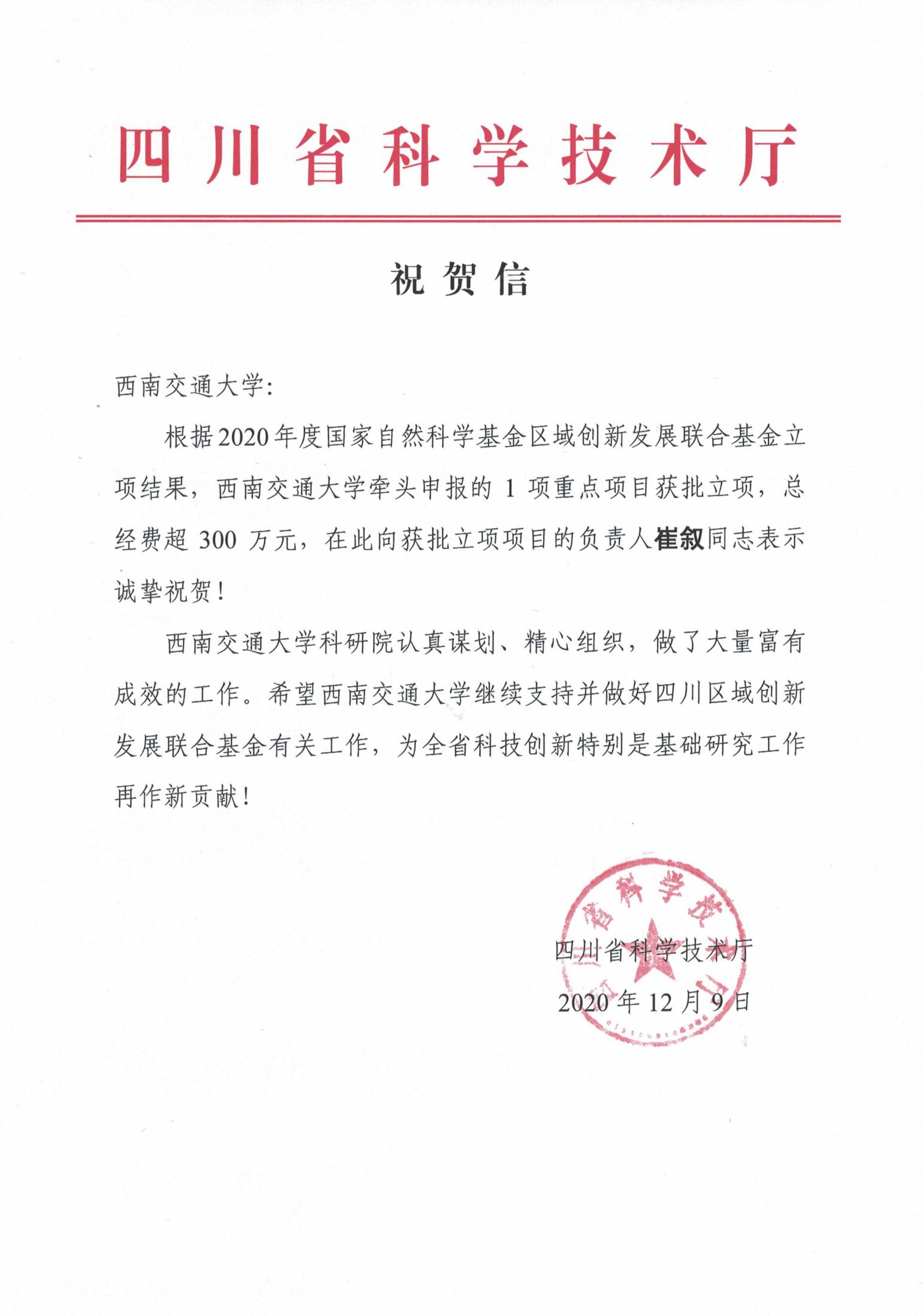 根据国家自然科学基金委员会和四川省科技厅通知,我院崔叙教授主持的“交通综合体与城市关联效应及效能优化方法研究”获批国家自然科学基金区域创新发展联合基金重点项目,实现了我院国家自然科学基金重点项目的突破。