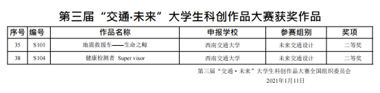 1月9日至10日,第三届“交通·未来”大学生科创作品大赛总决赛在上海交通大学举行。来自全国134所高校的729个团队报名参赛,专家组从中遴选出155件作品入围全国总决赛。经过激烈角逐,我院李然老师指导的参赛作品《地震救援车——生命之鲸》和《健康检测者Super visor》,本届大赛共评选出特等奖作品7件、一等奖作品22件、二等奖作品33件、三等奖作品49件。
