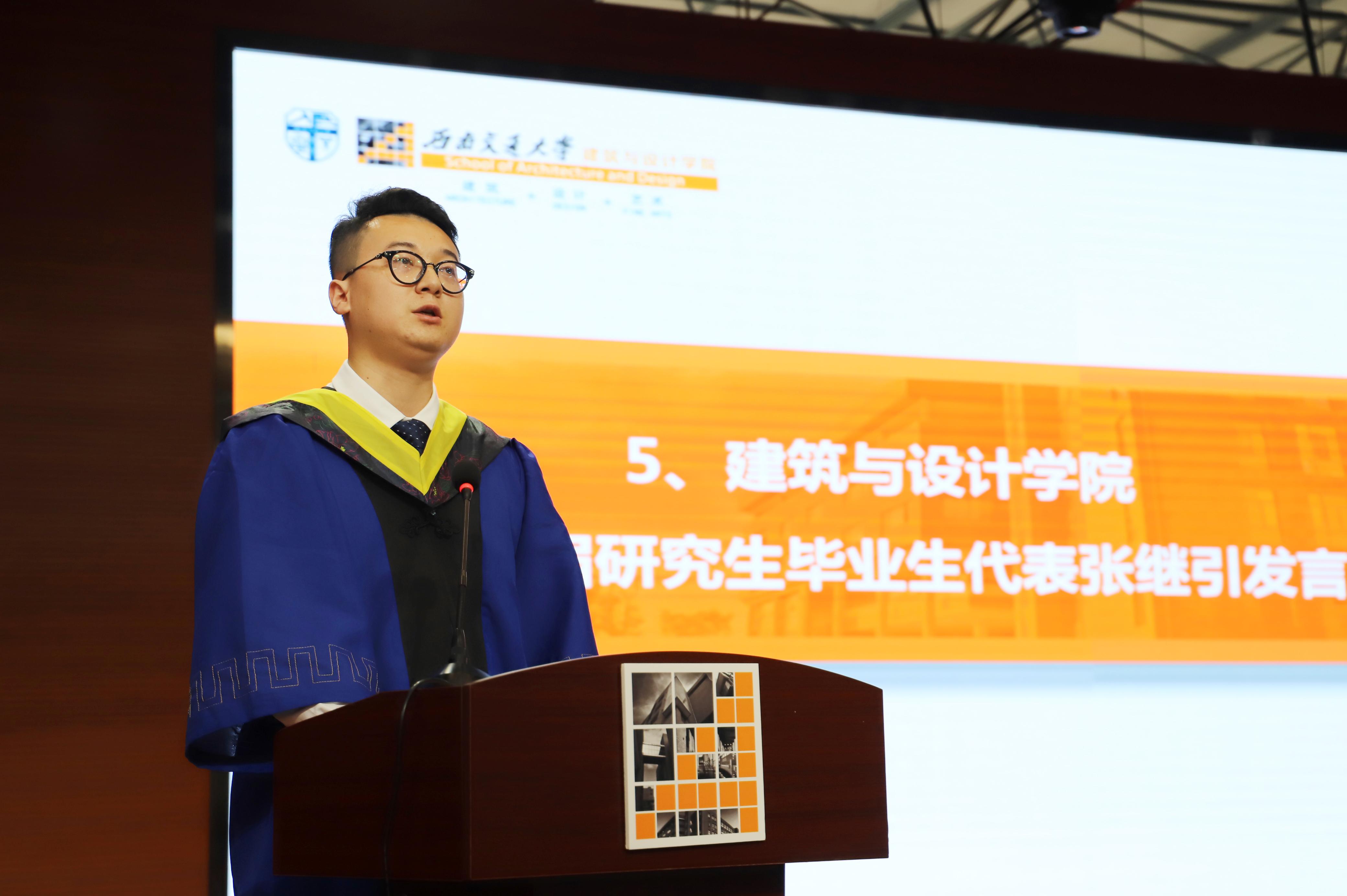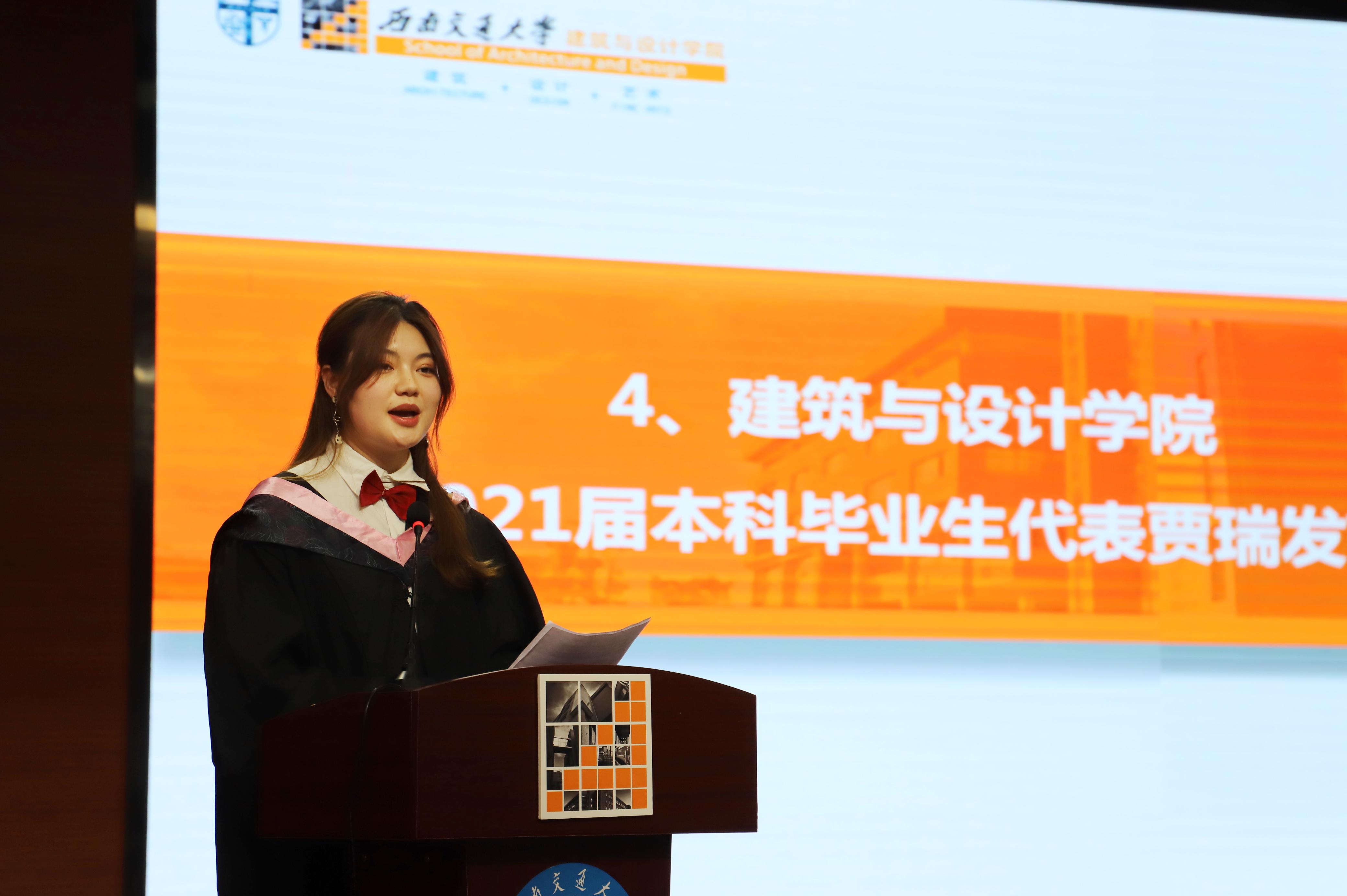 紧接着,建筑与设计学院2021届本科毕业生代表贾瑞和2021届研究生代表张继引发言。他们回顾了大学生活中刻骨铭心的记忆,感激母校和老师的培养,表示将会不负期望,努力成为母校的骄傲。