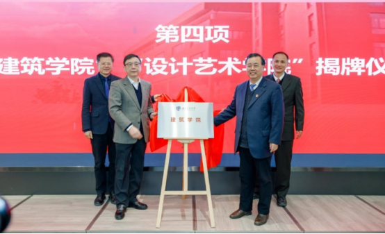 在热烈的掌声中,王顺洪、杨丹、建筑学院执行院长沈中伟、学院党委书记吴晓雄为建筑学院揭牌。