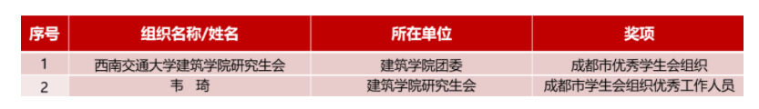 建筑学院研究生会荣获“2021年度成都市优秀学生会组织”荣誉称号,研究生会主席团成员韦琦同学荣获“2021年度成都市学生会组织优秀工作人员”荣誉称号。这既是对建筑学院团委、研究生会过去一年工作的充分肯定,也对未来的工作起到了积极的示范引领作用。