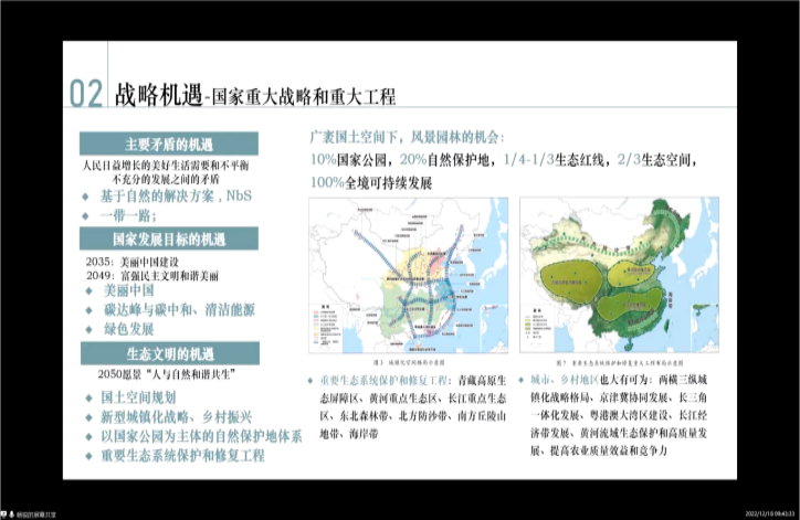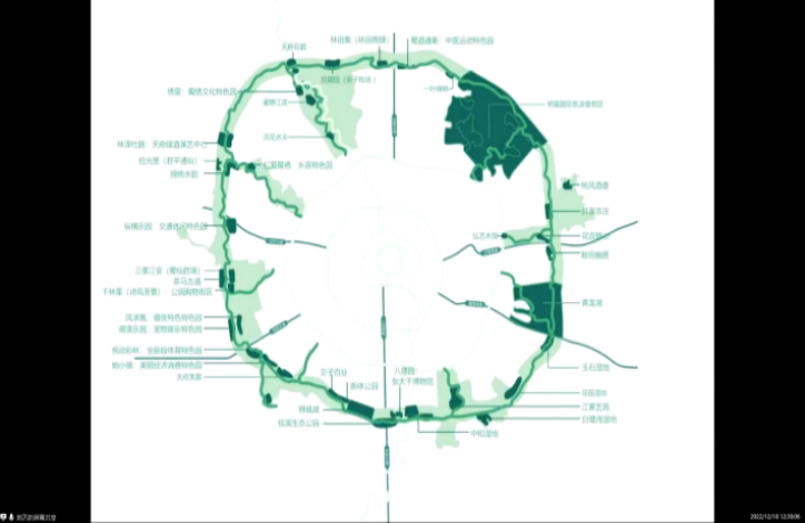 张静总建筑师的报告分为风景园林设计师生态逻辑思考、“公园城市”示范区探索与实践、风景园林设计师的使命担当三个部分。其从生物多样性入手,通过探讨城市多样发展的层次,并以(山)龙泉山森林公园、龙门生物多样性博览园、(水)城市河流——驿马河和条 条河的生态修复工程、(林)什邡市国家储备林建设项目、(田)天府绿道,(湖)兴隆湖水生态综合提升等工程为例,探讨景观设计师如何切入生态修复和生物多样性的表达。