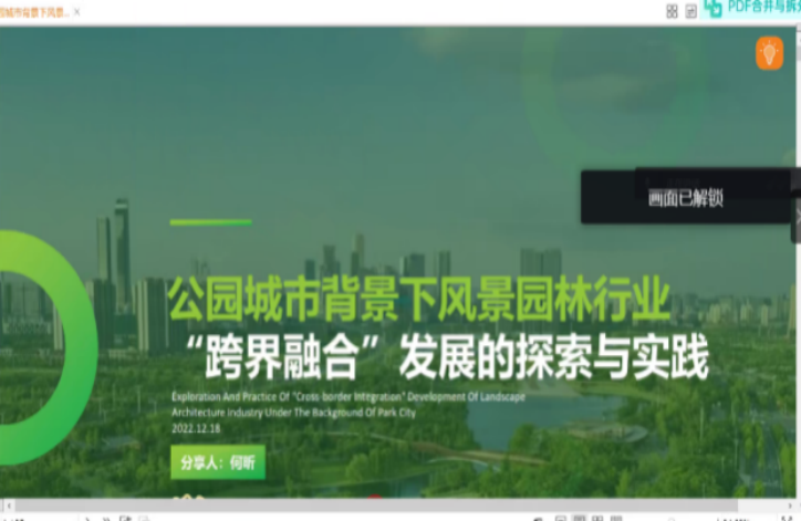 何昕副总经理通过探讨了风景园林行业在公园城市建设中的地位,指出传统孤岛化、分段式、重分工、流水化的业务执行方式已跟不上时代的需求。破局的关键点在于构建技术创新体系的有机融合,整合多专业,向集成化发展转型,并探索跨界融合的机制。