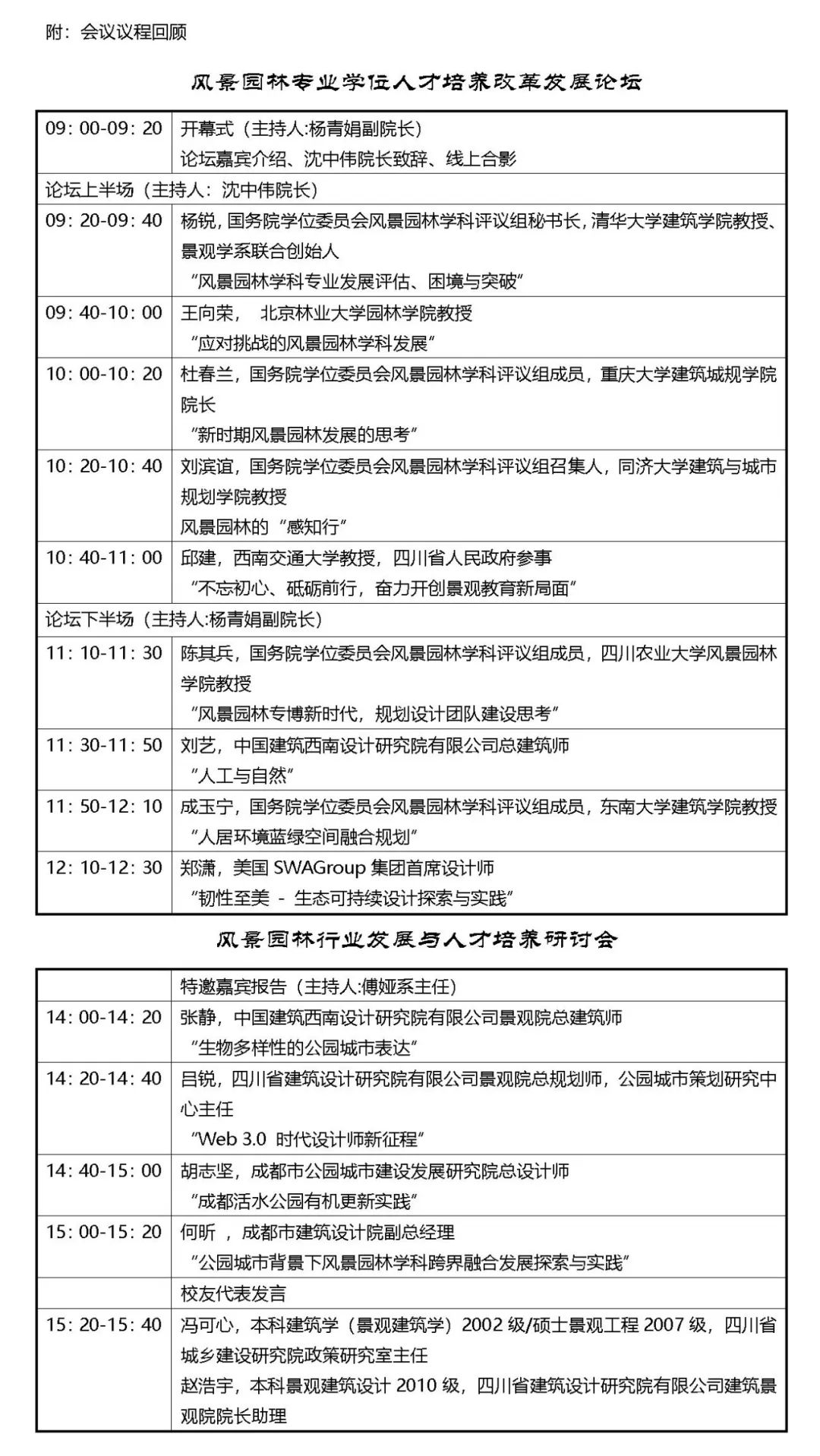 本次论坛来自各大高校和设计院的专家学者,包括国务院学位委员会风景园林学科评议组秘书长,清华大学建筑学院景观学系联合创始人杨锐教授,国务院学位委员会风景园林学科评议组召集人,同济大学建筑与城市规划学院刘滨谊教授,国务院学位委员会风景园林学科评议组成员,东南大学建筑学院教授成玉宁教授,国务院学位委员会风景园林学科评议组成员,重庆大学建筑城规学院杜春兰院长,国务院学位委员会风景园林学科评议组成员、四川农业大学陈其兵教授,四川省人民政府参事,探花视频