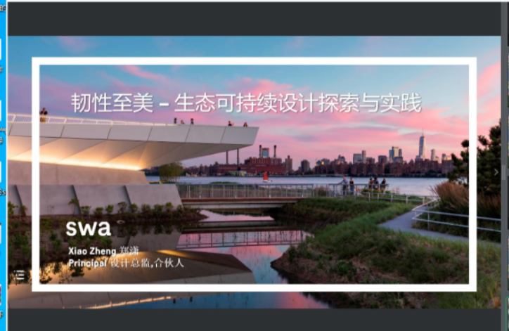 郑潇女士则图文并茂的从纽约猎人角滨水公园、休斯顿奥邦林梢步道、休斯顿水牛河3个设计案例入手,展示了美国SWAGroup集团近年来在生态可持续景观案例设计中的实践与探索,阐明了对行业未来发展的信心。