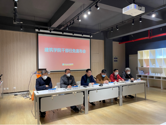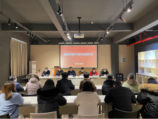 2023年1月3日上午,学校在建筑学院A100报告厅召开建筑学院干部任免宣布大会,宣布学校党委关于建筑学院领导班子调整任命的决定。学校党委常委、副校长姚发明、党委组织部常务副部长宋新、副部长陈青山出席本次会议,建筑学院党政领导班子成员、党委委员、各系主任、各科室主任等参加会议。会议由陈青山副部长主持。