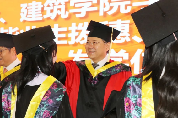 奏唱国歌后,建筑学院执行院长沈中伟教授致辞中指出毕业典礼和学位授仪式是每一位在校的毕业生人生中最难忘的时刻,这一刻即将开启自己的事业人生。沈院长还在致辞中嘱托毕业生们四点希望:一是要学会两眼“发光”,学会用积极的态度看待一切。要树立正确的人生观、事业观,价值观,要以积极的心态投入到社会中。要以学院多年培养所形成的修养、礼仪、能力积极对待世界,解决问题,必须良好的心态面对任何困难。二是要仰望星空,在每一个时间节点上,都应该给自己目标,没有理想人就会消极,在理想与追求之下,我们永远会有积极的态度去开创未来。三是要脚踏实地,要做到言行一致,笃行致远。我们为什么学习建筑构造,我们为什么要有建造节,就是同学们把自己的理想所学的理论投入到实践,理论结合实际,尽精微,方能致广大。四是一定要品行端正,要做到问心无愧,人生是漫长的,在未来工作的30-40年。我们不能有半点虚假,不能投机取巧,也不能华而不实。所以,品行端正是成就人生最重要的一个法宝。最后就是在利益面前要有大局,在困难面前要有担当,在矛盾面前要有胸怀,这也是我的人生观。希望我们在座的同学们能够成为一名优秀的建筑学院毕业生,去往祖国最需要的地方。虽然,我们即将分别,但母校永远为你敞开大门,望你们多回母校,曾经你们以学校为荣,未来学校将以你们为荣!