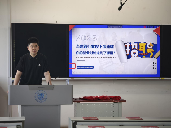 为促进学生了解就业动向、明晰就业形势,进一步提升建筑学子对专业的认同,拓宽实习就业的渠道,促进学生高质量充分就业,建筑学院于2025年5月8日下午,在八号教学楼8535教室举办了“当建筑行业按下加速键,你的就业时钟调到了哪里”就业指导讲座。本次宣讲邀请了基准方中建筑设计有限公司人力资源部助理主任傅捷以及基准方中建筑设计有限公司的2024届建筑学院优秀毕业生候建哲作为主讲嘉宾。