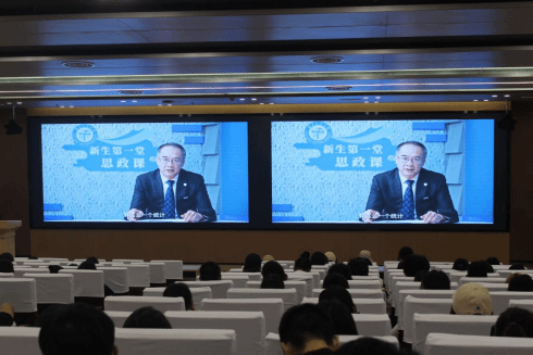 党委书记余敏明以视频的形式向2023级新生表示了衷心的祝贺与热烈的欢迎并为新生进行了大学的第一堂思政课。视频中,余书记讲述了学校办学史及办学以来校内优秀共产党员的杰出事迹。他指出:同学们应根植深厚的爱国情怀,践行“五老”开创的“双严”理念,努力向优秀前辈学习。同时,余书记以学校超高水平的轨道交通专业为例对学校未来发展做出展望。最后,余书记嘱咐同学们要将爱国之情落实到勤奋学习中去,把奋斗作为不懈追求并将创新作为前进的动力。