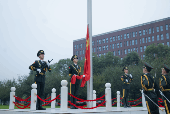 国旗班护送国旗步伐整齐地走向旗杆。同学们凝视着国旗,行注目礼。嘹亮的国歌声响起,在场的全体师生齐声高唱中华人民共和国国歌。