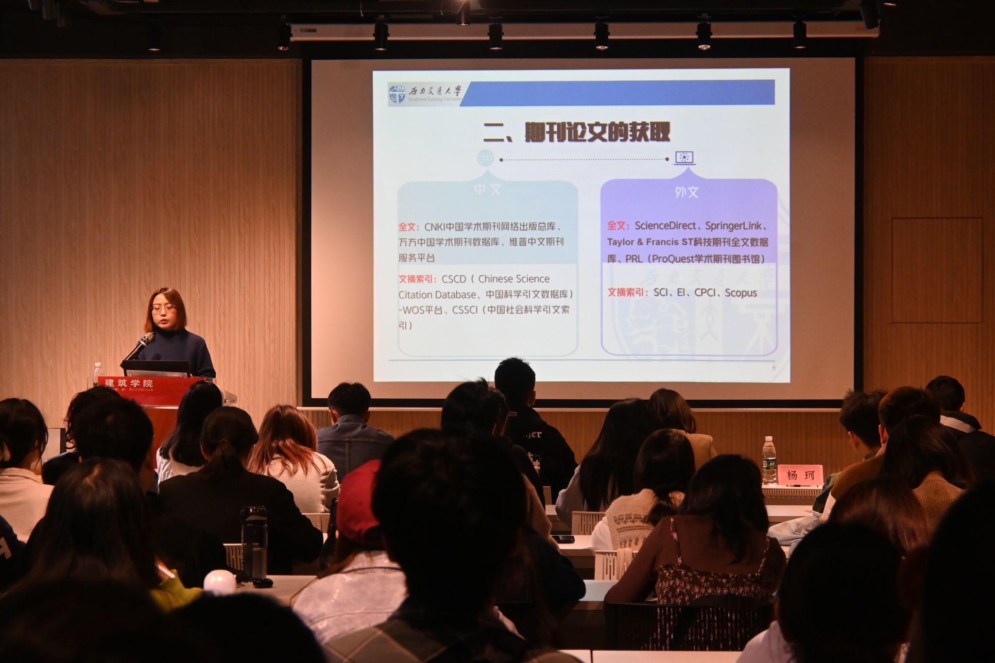 图书馆馆员李颖老师作为主讲人,建筑学院杨珂老师、王文静老师、罗勋锐老师出席本次讲座。同时参与讲座的还有交通运输与物流学院研究生会主席王箐、力学与航空航天学院研究生会主席李思雨,以及建筑学院80余名研究生。