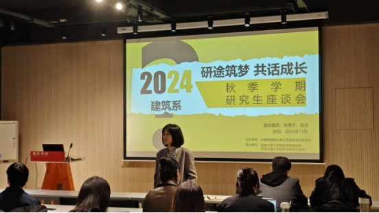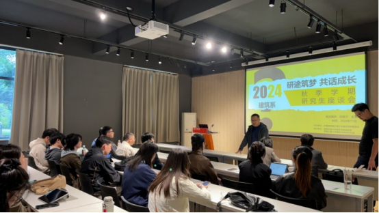 建筑学院的建筑系与研究生会承办的“研途筑梦 共话成长”建筑系2024秋季学期研究生座谈会在学院A100报告厅举行。本次交流主题主要围绕研究生培养方案、毕业论文撰写及审阅流程,以及学生成长相关问题进行。学院副院长、建筑系主任张樱子老师,建筑系副主任宣湟老师,建筑系党支部书记、副系主任熊瑛老师,24级研究生辅导员王振世老师,以及建筑系研2024级全体同学参加座谈会。