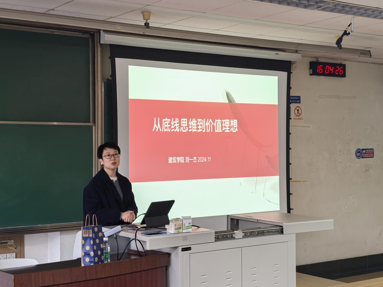 2024年11月28日下午16点,建筑学院2024级研究生于九里校区4号教学楼J4224成功举办了一场主题为“从底线思维到价值理想”的专题讲座。本次讲座有幸邀请了建筑学院党委副书记刘一杰老师作为主讲嘉宾,旨在帮助广大学生树立正确的思维方式,提升自我管理水平,同时引导学生树立崇高的价值理想,为未来的成长和发展奠定坚实基础。参与本次讲座的还有研究生新生辅导员王振世老师以及2024级全体研究生。
