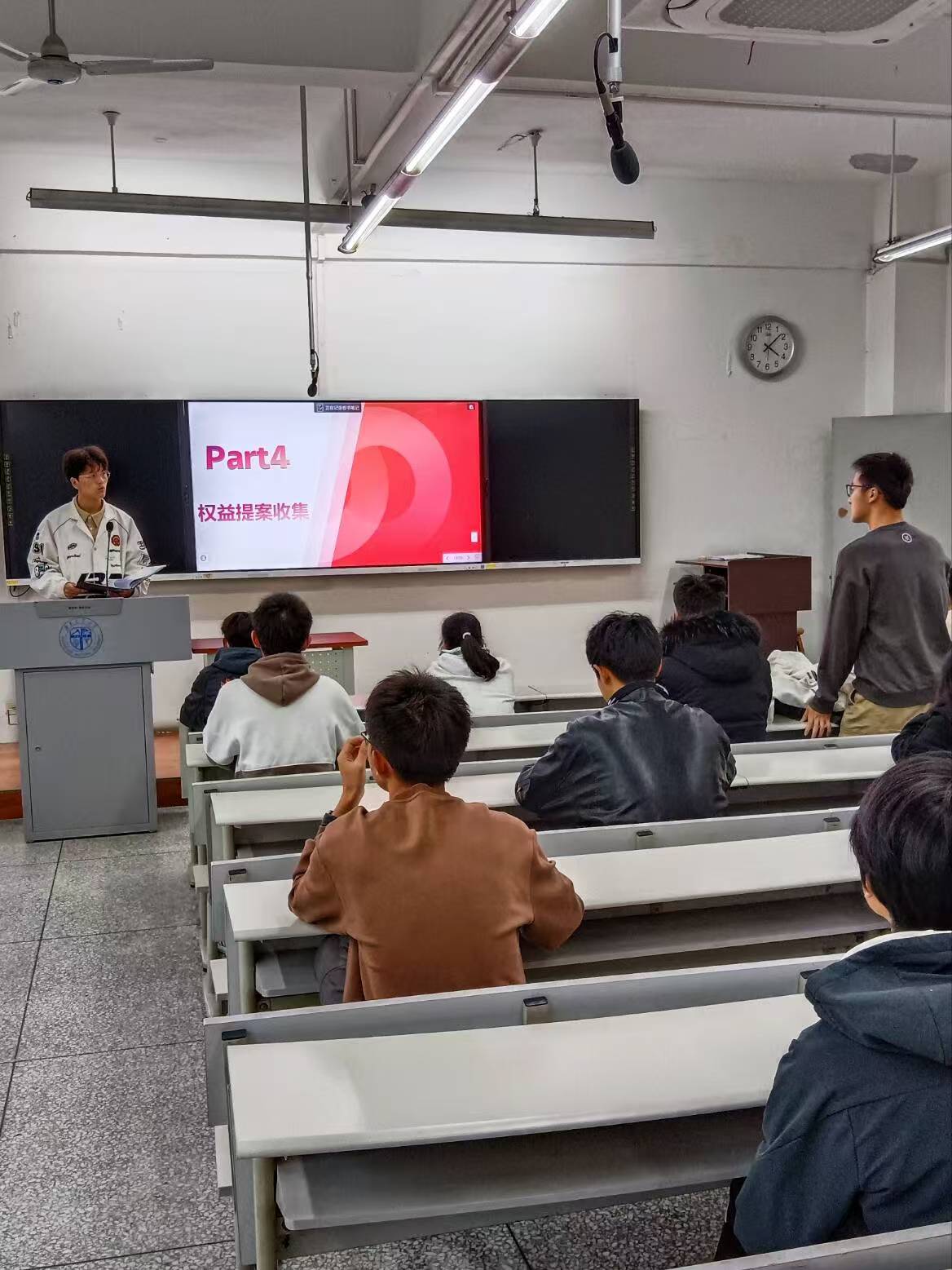 大会伊始,由学院学生会权益部部长韩明宇同学进行开场致辞及工作汇报。韩明宇同学首先回顾了权益部自开学以来所开展的一系列工作,包括但不限于调查研究、提案收集、问题反馈等环节。他特别强调了几项受到广泛关注的重点提案,如宿舍设施改善、校园安全措施加强以及心理健康服务优化等方面,并详尽介绍了这些提案当前的处理进展及已取得的初步成效。此外,他还代表权益部向全体参会人员郑重承诺,将继续不懈努力推进各项权益工作的深入开展,致力于为全院学生创造一个更加公平公正的学习生活环境。
