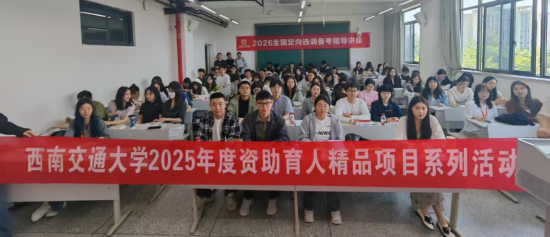 研究生会主办的2025年度资助育人精品项目系列活动“镜湖半月谈——2025年四川公务员(选调生)备考指导专题讲座”在犀浦校区X8535教室举行。四川金标尺教育集团资深讲师康鑫智老师、建筑研2022级阮少峰同学担任主讲嘉宾;建筑学院专职辅导员、研究生会指导老师王威,2024级研究生辅导员王振世老师,土木工程学院研会主席梁世强,交通运输与物流学院研会主席陈汐等嘉宾及百余名研究生参与活动。