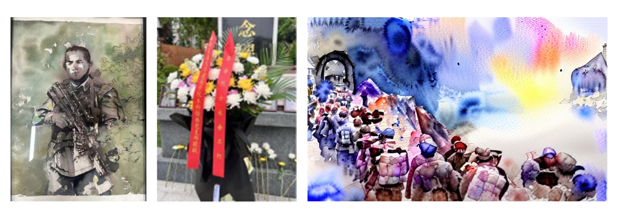 上午10时,佩戴手作白花的成员们在纪念碑前整齐列队。活动特别设置"手绘追思"环节:成员提前绘制的水彩英烈肖像卡、手写挽联花圈、原创主题包花纸等创意载体,将艺术表达融入缅怀仪式。在庄严肃穆的献花仪式中,由30余朵手折纸花组成的花圈中央,悬挂着"青春铸丰碑"主题绘画,两侧挽联"丹心昭日月,碧血染山河"墨迹未干,无声诉说着新时代青年对先烈的崇高敬意。
