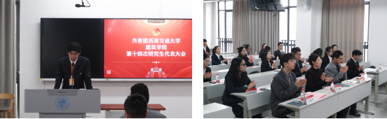 建筑学院第十四次研究生代表大会在犀浦校区X8525教室成功举行。建筑学院研究生专职辅导员、研究生会指导老师王威,研究生辅导员王文静老师、辅导员王振世老师,第十三届研究生会主席任佳鑫及各学生代表出席此次大会。