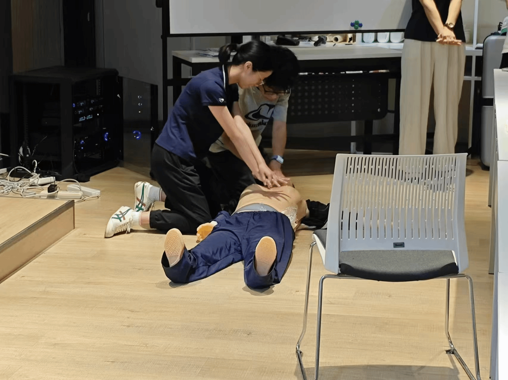 在实操环节,同学们进行了急救技能练习。医学院提供了多具急救训练假人,供参与者模拟真实急救场景。培训人员现场指导参与者规范操作心肺复苏各个环节,包括判断意识、胸外按压、开放气道和人工呼吸等步骤。参训人员认真练习,反复纠正动作要领,确保掌握正确急救方法。此外,活动还特别设置了创伤救护培训区,由专业培训师演示了环形包扎、螺旋包扎等多种止血包扎技术。参与者两人一组互相练习,培训师逐一指导包扎手法和力度控制。
